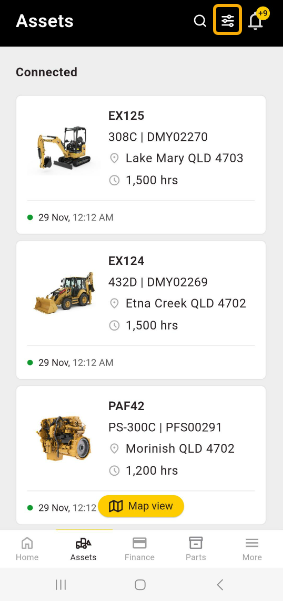 - At the top of Assets / Finance and Parts you will find the filter icon